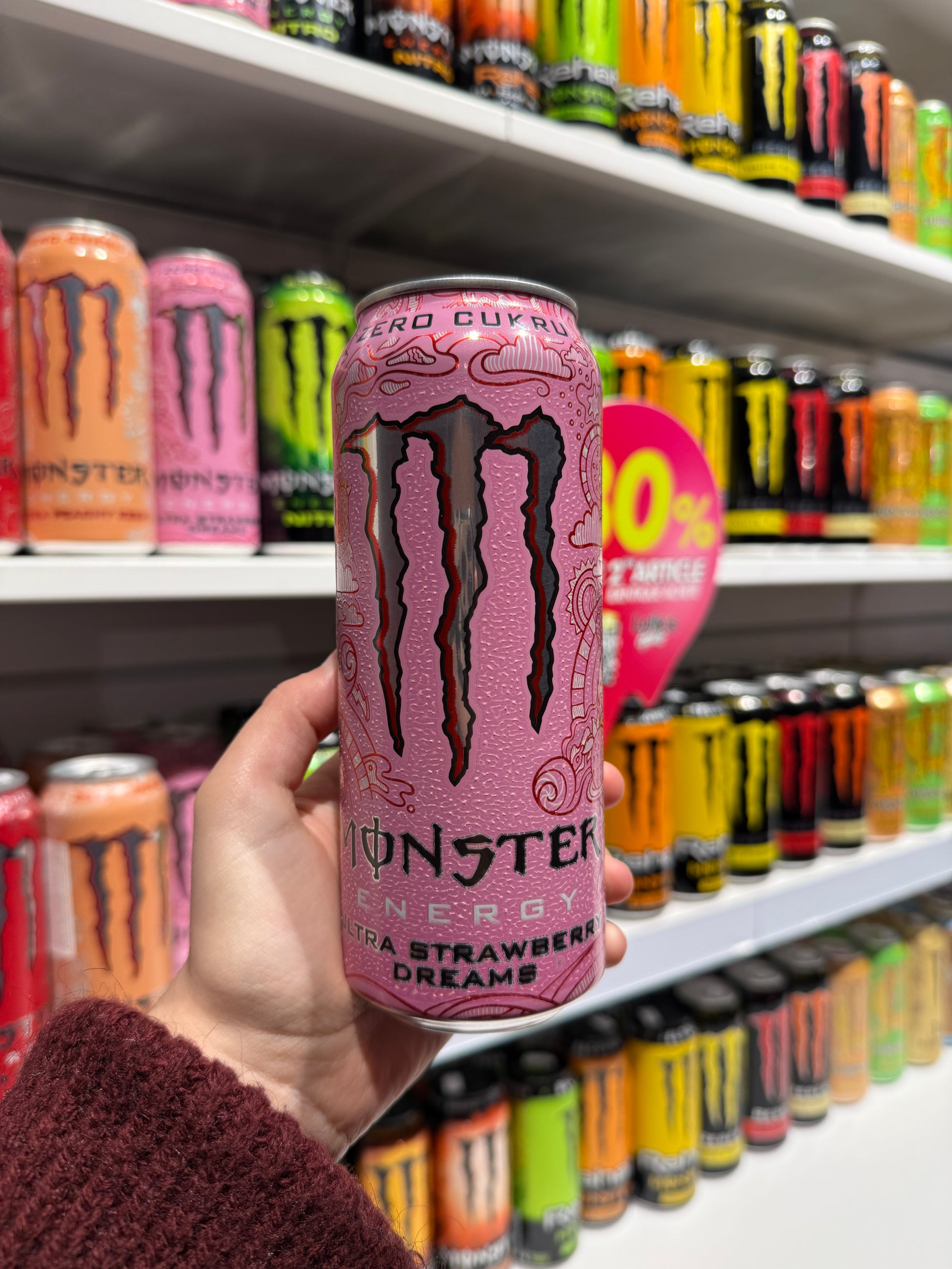 Découvrez la Monster Energy Strawberry Dreams : une boisson énergisante vitaminée à la fraise, sans sucre.