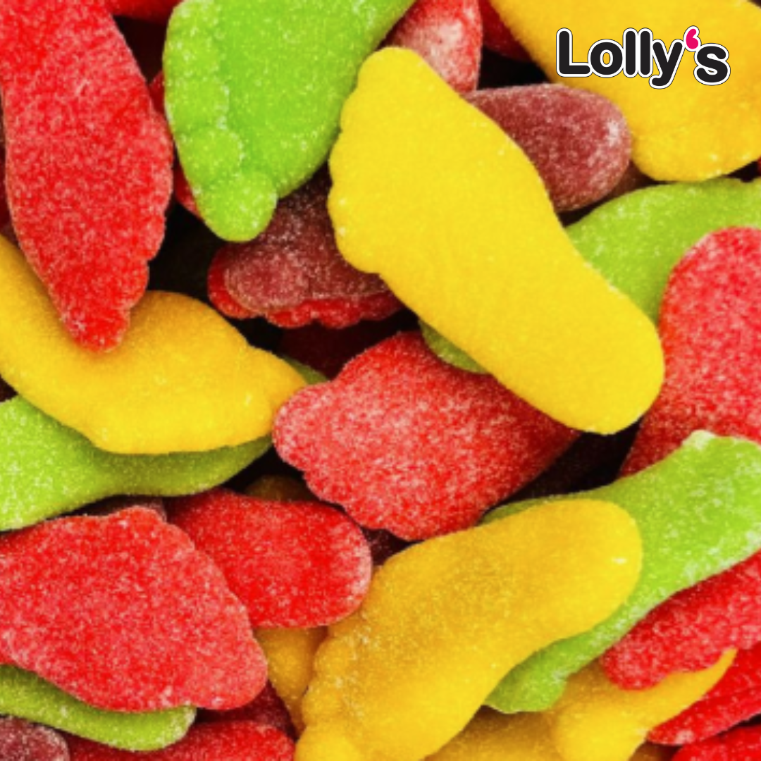 Découvre les Pieds Acidulés : des bonbons en forme de pieds avec une texture ultra moelleuse et étirable, aux saveurs de fraise, pomme et citron. 🍓🍏🍋